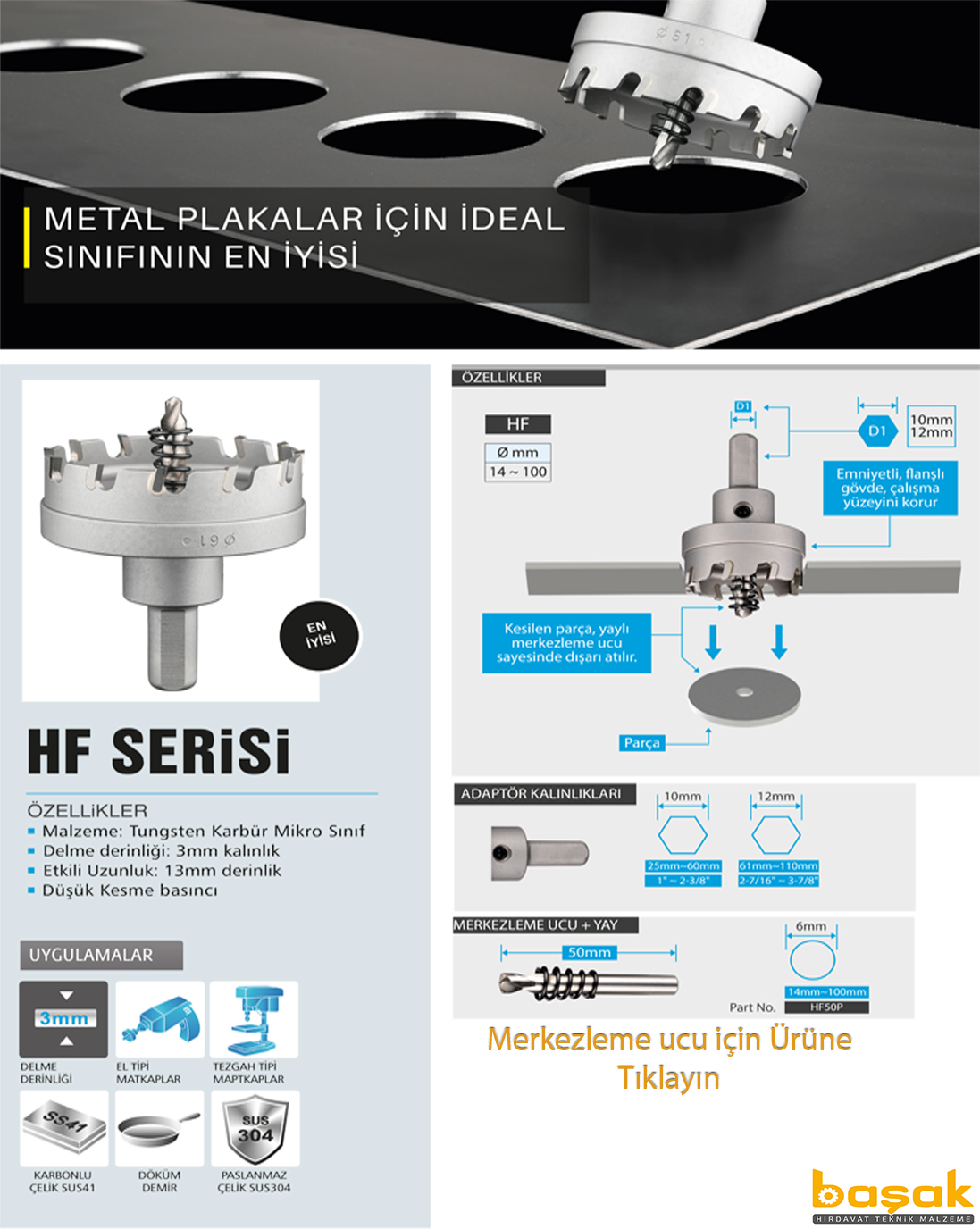 HF50 metal delik açma testeresi, mandrenli matkap adaptörü, yaylı merkezleme ucu ile set halinde satılmaktadır. Farklı makinelerde de kullanabilmeniz için adaptörler mevcuttur. Bu adaptörler, Hf50 delik açma testeresini daha kullanışlı hale getirmektedir.