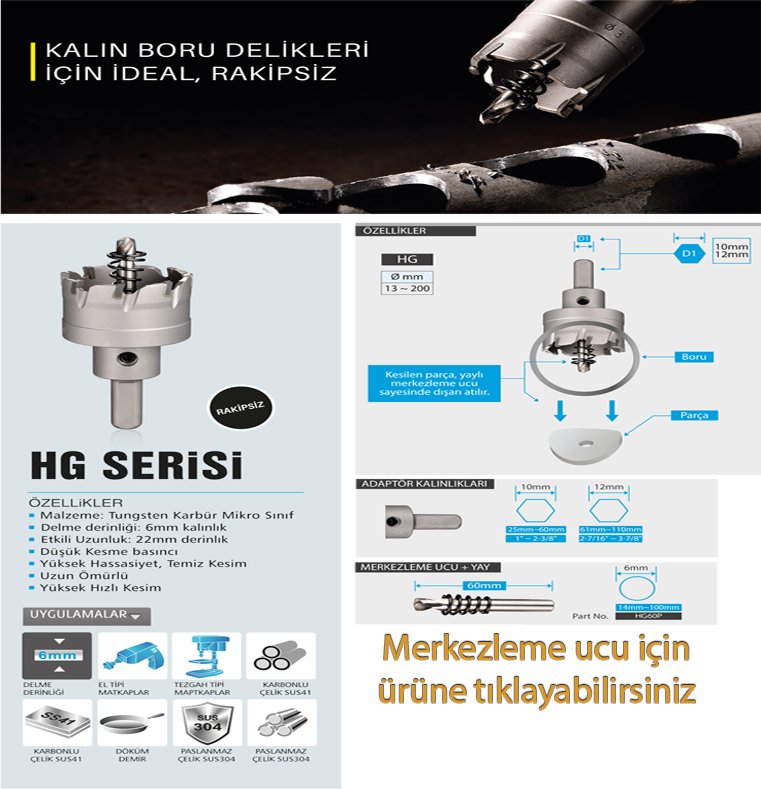 Yüksek kaliteli HG 60 serisi paslanmaz metal kesme elmaslı pançları, paslanmaz çelik, karbonlu çelik, çelik boru, paslanmaz boru, farklı malzemelerin delik işlemlerinde, 5mm malzeme kalınlığına kadar rahatlıkla kullanabileceğiz, delik açma testereleridir. Pürüzsüz ve temiz delikler delmenizi sağlar.